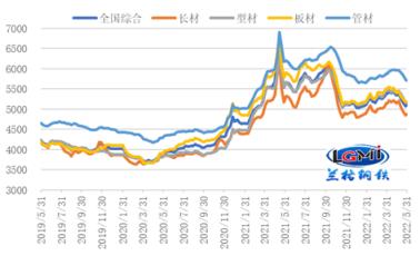 5月份,穩(wěn)增長信號和政策雖明顯加強(qiáng),但受疫情影響下游需求釋放緩慢,市場預(yù)期和信心明顯不足,國內(nèi)無縫鋼管市場價(jià)格持續(xù)震蕩下行。據(jù)云商平臺監(jiān)測數(shù)據(jù)顯示,截至5月31日,全國無縫鋼管 厚壁鋼管綜合價(jià)格為5098元,較上月末下跌258元,跌幅為4.8%,年同比下跌10.6%。其中,長材價(jià)格為4875元,較上月末下跌288元,跌幅5.6%,年同比下跌8.9%;板材價(jià)格為5190元,較上月末下跌235元,跌幅為4.3%,年同比下跌12.8%;型材價(jià)格指數(shù)為5166元,較上月末下跌241元,跌幅為4.5%,年同比下跌9.6%;管材價(jià)格為5716元,較上月末下跌241元,跌幅為4.1%,年同比下跌8.2%(詳見圖1)。