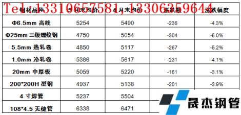 分品種來看,云商平臺監(jiān)測的8大無縫鋼管 厚壁鋼管品種10大城市均價(jià)顯示,5月31日,各品種價(jià)格相比上月底均明顯下跌,其中,三級螺紋鋼跌幅最大,為6.0%;無縫管跌幅最小,為2.1%;其他品種跌幅在3.1-5.2%之間(詳見表1)。