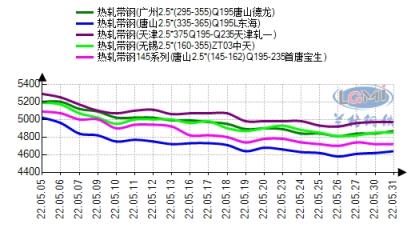 五月份國內(nèi)帶鋼市場基本呈現(xiàn)震蕩弱行態(tài)勢。帶鋼市場在月初受公共衛(wèi)生事件影響,鋼企復工復產(chǎn)積極性低迷,貿(mào)易商心態(tài)以謹慎觀望為主。市場隨著下游需求恢復緩慢,市場活躍度較低,成交量平平。但中旬隨著相關政策的出臺,物流運輸方面仍受限,加之焦炭第二輪提降落地,市場看空情緒加重。下旬伴隨各地疫情反復,市場停滯狀態(tài)仍存。商貿(mào)迫于成本壓力挺價意愿濃厚,然需求寥寥,無奈小幅降價促進成交。截止至5月31日,華北地區(qū)唐山小窄帶報價主流為4720元/噸,唐山355系窄帶鋼主流報價為4640元/噸,天津355系窄帶主流報價為4970元/噸,華東地區(qū)無錫355系窄帶主流報價為4850元/噸,華南地區(qū)廣州355系窄帶主流報價為4870元/噸。
