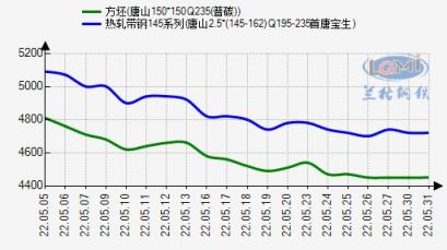 上游情況,5月份鋼坯價格與小窄帶價格運行趨勢主要以震蕩調(diào)整為主,5月焦炭四輪提降,市場心態(tài)偏謹慎,整體成本壓力不小。據(jù)云商平臺監(jiān)測數(shù)據(jù)顯示,截至5月31日,唐山鋼坯價格4450元/噸,較上月同期降310元/噸,相比月內(nèi)峰值(5月5日)4810下降360元。唐山經(jīng)安、國義145mm小窄帶價格4700元/噸,較上月同期降280元/噸,相比月內(nèi)峰值(5月5日)5060下降360元。調(diào)坯廠開工始終不溫不火,市場成交平平。小窄帶與方坯的價差維持260元左右,較上月價差有所收縮,主要受原料端強勢壓縮利潤空間影響,使得小窄帶系列產(chǎn)品利潤較薄。市場挺價心態(tài)偏強,價格多跟隨期貨盤面的調(diào)整而變動。