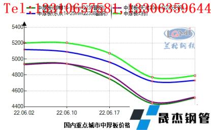 6月份上旬國內(nèi)宏觀市場消息面多空博弈,下游商家觀望情緒加重,國內(nèi)中厚板市場需求受到壓制,市場報價小幅趨弱。而后因美聯(lián)儲激進加息政策出臺,全球金融市場受到?jīng)_擊加劇,使得目前本已處于經(jīng)濟下行期的全球經(jīng)濟再次承壓,對于國內(nèi)市場直接反饋至期貨市場,在美聯(lián)儲加息消息發(fā)酵后,期現(xiàn)市場短期內(nèi)呈現(xiàn)斷崖式下跌,在不足一周的交易日內(nèi),國內(nèi)中厚板均價下調(diào)幅度在240元左右,相較于其他厚壁鋼管品種,中厚板市場抗跌性仍處于強勢一方。