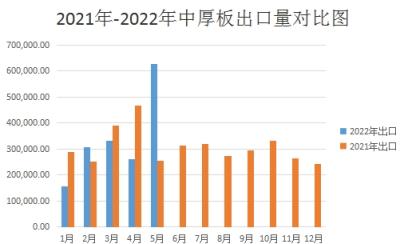 至于出口方面,據(jù)不完全統(tǒng)計,2022年5月份國內(nèi)中板出口量約為62.84萬噸,環(huán)比4月份出口量增加約36.75萬余噸,與2021年同期相比出口量增加約37.29萬噸左右,因疫情得到有效控制,加之價格逐步企穩(wěn),積壓訂單明顯釋放。