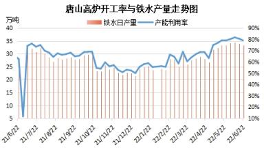 據網調研數據顯示:截至6月22日,唐山區域高爐產能利用率78.89%,環比上月下跌0.11個百分點;鐵水日均產量較上月減少0.05萬噸。