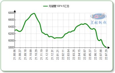 據(jù)云商平臺監(jiān)測數(shù)據(jù)顯示:截至7月29日,國內(nèi)十大主導城市108*4.5無縫管市場均價5805元,較上月同期跌205元。